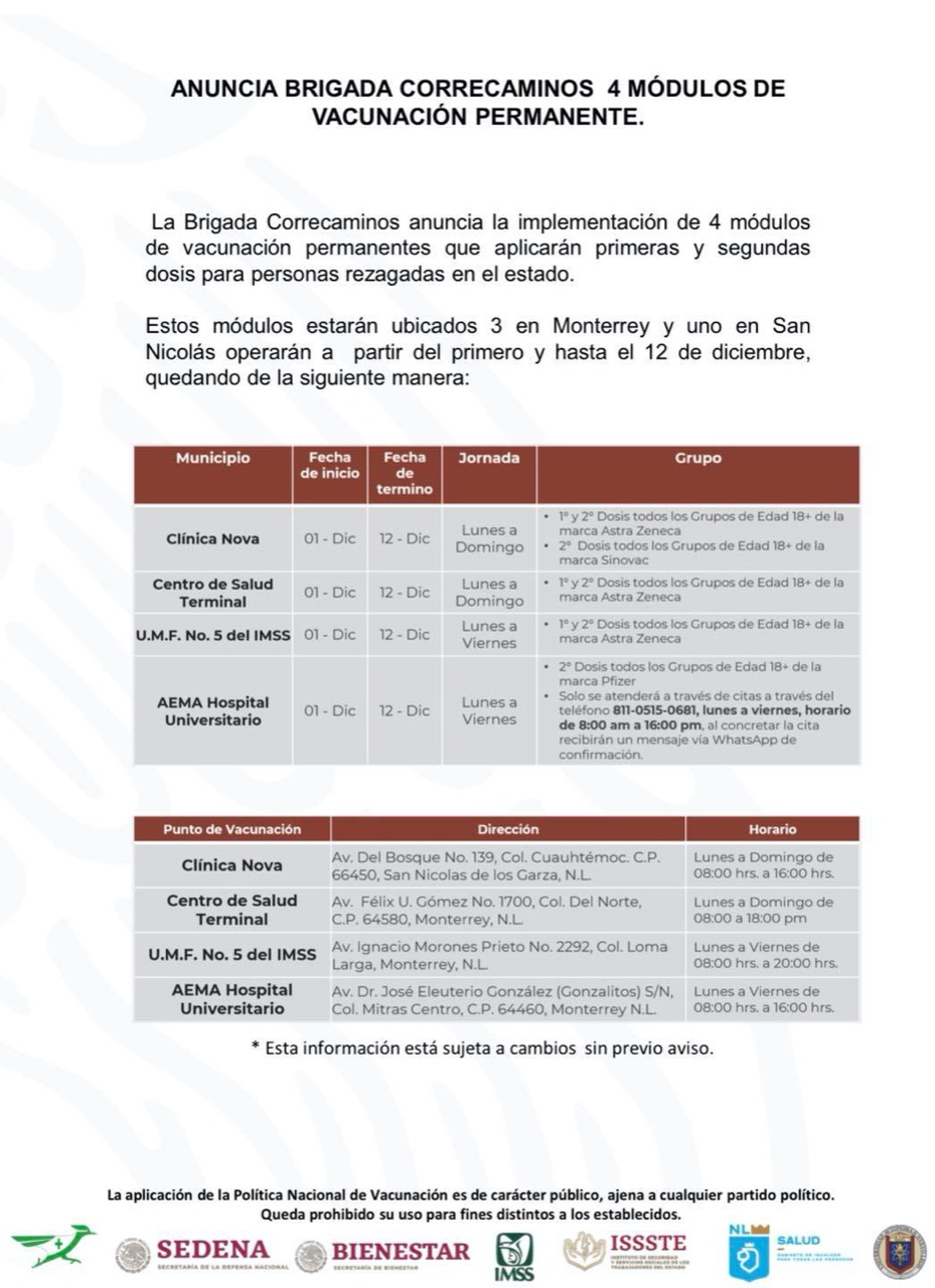 Por espacio de 12 días, del 1 al 12 de diciembre, se instalarán en Nuevo León 4 módulos de vacunación permanente para primeras y segundas dosis de vacunas anticovid.