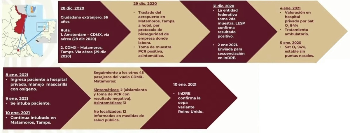 Alomía compartió el itinerario de la persona que resultó infectada con la variante B117, en que es una persona de nacionalidad británica de 56 años que se encuentra actualmente intubado en un hospital privado en Matamoros, Tamaulipas, debido a las complicaciones que le ha provocado el covid-19.