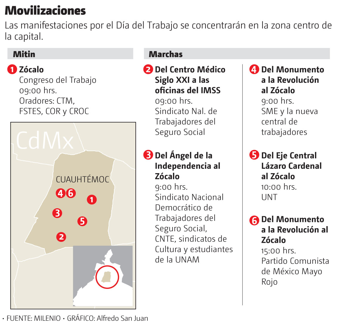 ¡Planea tu ruta! Hoy se prevén nueve movilizaciones y concentraciones en la zona centro de la Ciudad de México, con motivo de la conmemoración del Día del Trabajo.
