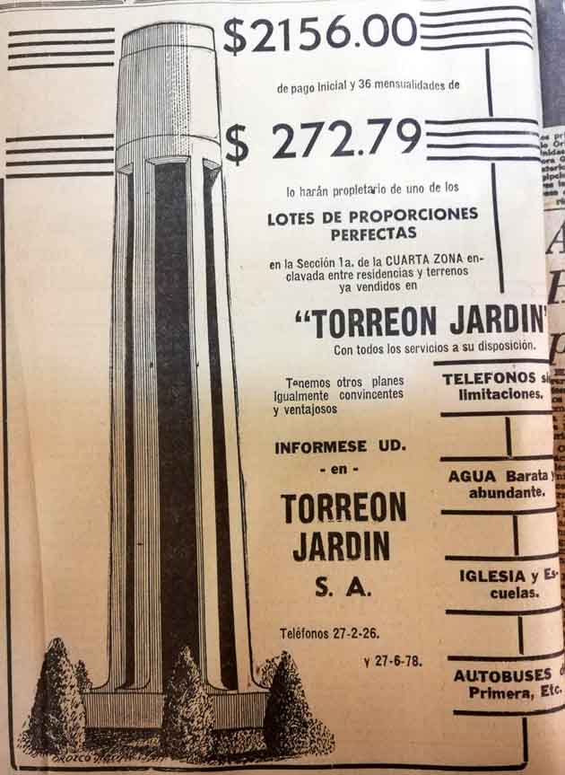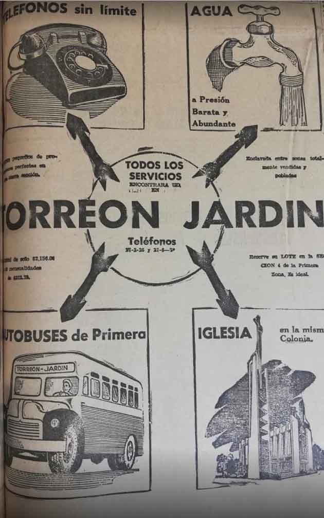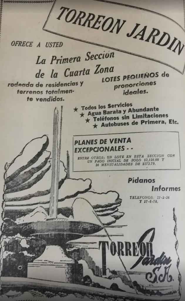 En el año 1957 se anunciaron impresiones lo que sería la venta de terrenos en la Primera Sección de la Cuarta Zona en la colonia Torreón Jardín, en el periódico La Opinión.