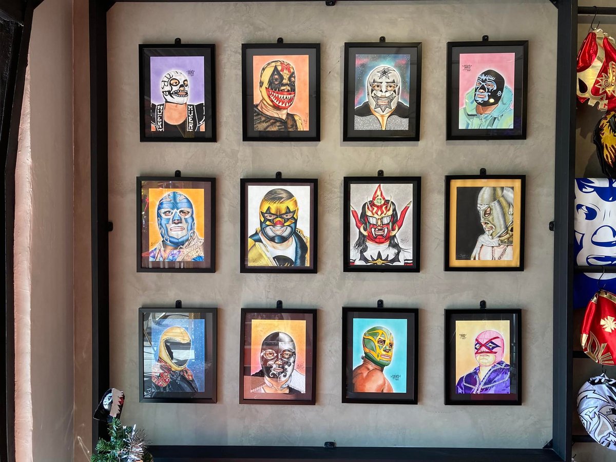 En las paredes de este lugar cuelgan las obras de arte que por años ha hecho el Saiko, con color, paciencia y mucha ilusión el hombre dibuja retratos de sus luchadores favoritos, estos cuadros también están a la venta, algunos más le han servido de intercambio con los luchadores para hacerse de más máscaras.