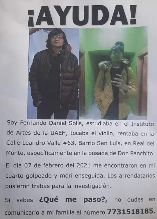 En esta desesperación, Martha y su familia se han dedicado a colocar volantes para saber si alguien tiene mayor información y esclarecer la muerte de Fernando, el joven estudiante del Instituto de Artes de la Universidad Autónoma del Estado de Hidalgo (UAEH), quien tocaba el violín en las calles del Pueblo Mágico para obtener dinero y seguir pagando la renta de un cuarto que, como cientos, no está regularizado.