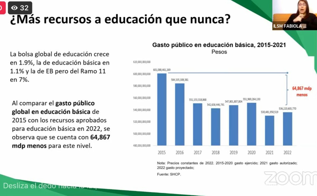 De acuerdo con David Calderón, presidente ejecutivo de “Mexicanos Primero”, el presupuesto para el próximo año es 64 mil 867 millones de pesos menos que el que se aplicaba en educación básica en 2015, con lo que desaparecieron cinco programas básicos de atención en infraestructura, contenidos, capacitación para docentes y el desarrollo de capacidades escolares que dejó en seria afectación a miles de estudiantes en todo el país a lo largo de los últimos dos años como resultado de la pandemia.