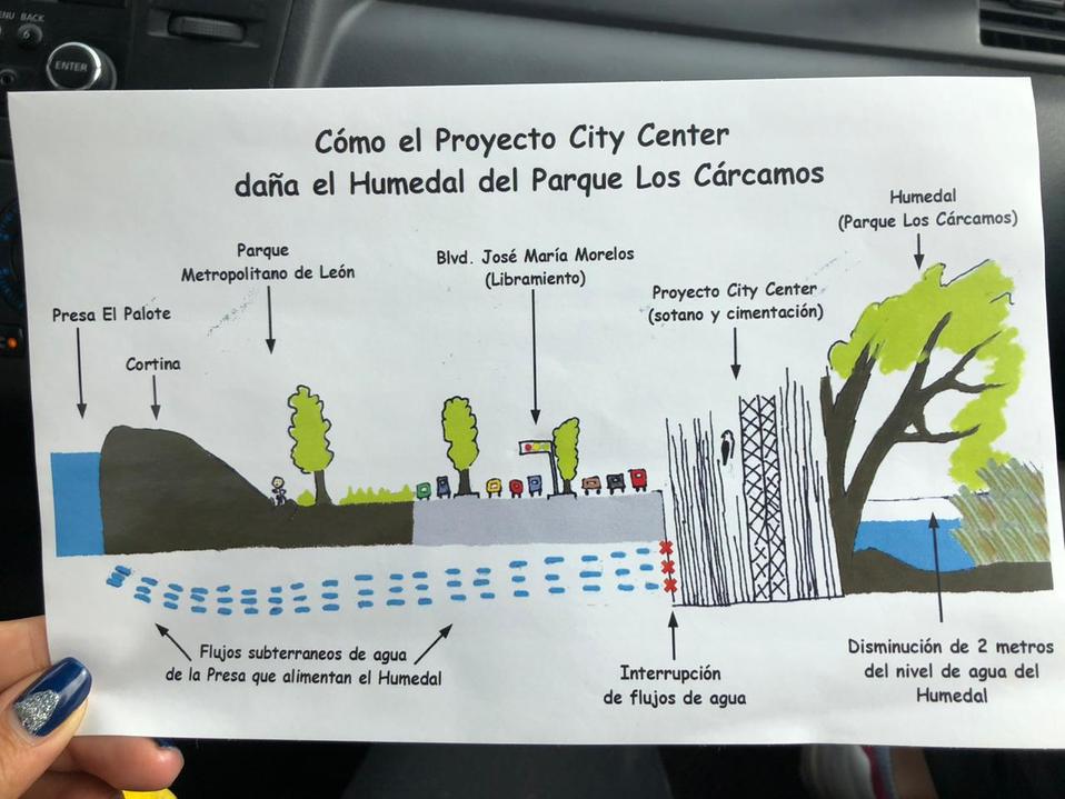 Además se han dañado los flujos de agua subterráneos que conectan a ambos parques, puesto que entre ellos se pretende construir el sótano de esta edificación. Esto afectará al manto freático de la zona y provocará la seca del humedal Los Cárcamos, ecosistema que ya está sufriendo los estragos de esta situación. Explicó a través de una ilustración.