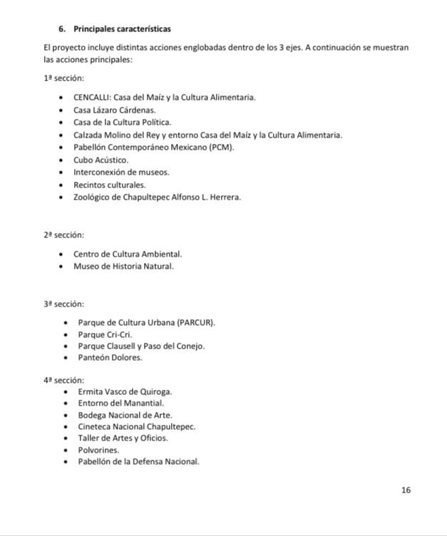 El “Proyecto Integral del Complejo Cultural Bosque de Chapultepec”, contempla desarrollar acciones en materia ambiental, movilidad y socio-cultural en las tres secciones; la primera contará con la Casa del maíz y la cultura alimentaria, Casa Lázaro Cárdenas, Casa de la cultura política, Pabellón Contemporáneo Mexicano, entre otros.
