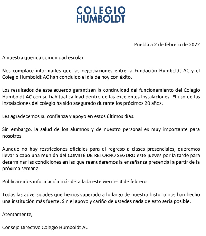 “Nos complace informarles que las negociaciones entre la Fundación Humboldt AC y el Colegio Humboldt AC han concluido el día de hoy con éxito. Los resultados de este acuerdo garantizan la continuidad del funcionamiento del Colegio Humboldt AC con su habitual calidad dentro de las excelentes instalaciones. El uso de las instalaciones del colegio ha sido asegurado durante los próximos 20 años. Les agradecemos su confianza y apoyo en estos últimos días”, destaca el documento.