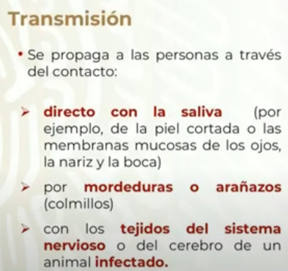 Ruy López Ridaura, director General del Cenaprece, explicó en el marco de la Jornada Nacional de Vacunación Antirrábica Canina y Felina 2020 que es una enfermedad que se transmite por el contacto entre animales salvajes o domésticos y humanos, a través de una mordedura o un rasguño.