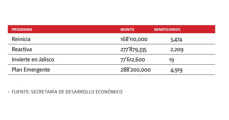Con el Plan Emergente de Protección al Empleo se dispersaron 288 millones 200 mil pesos y se protegieron 28 mil 820 empleos a través de los beneficiarios. En tanto que con el Programa Invierte en Jalisco contempló 77 millones 612 mil 600 pesos, lo cual resultó en la generación de 6 mil 448 empleos.