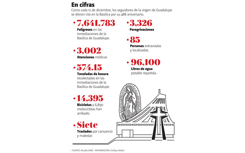 Al corte de las 20 horas, la alcaldía de Gustavo A. Madero informó que más 7 millones 600 mil feligreses se congregaron en las inmediaciones del recinto religioso, adornado con estrellas de Belén y con flores blancas y rojas.