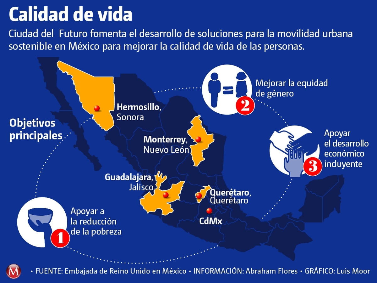 La embajada de Reino Unido en México presentó, a través del programa Ciudades del Futuro, un paquete de "apoyos extraordinarios de movilidad post-covid", con el objetivo de contribuir en las estrategias progresivas para las ciudades de Monterrey, Hermosillo, Guadalajara, Querétaro y CdMx.