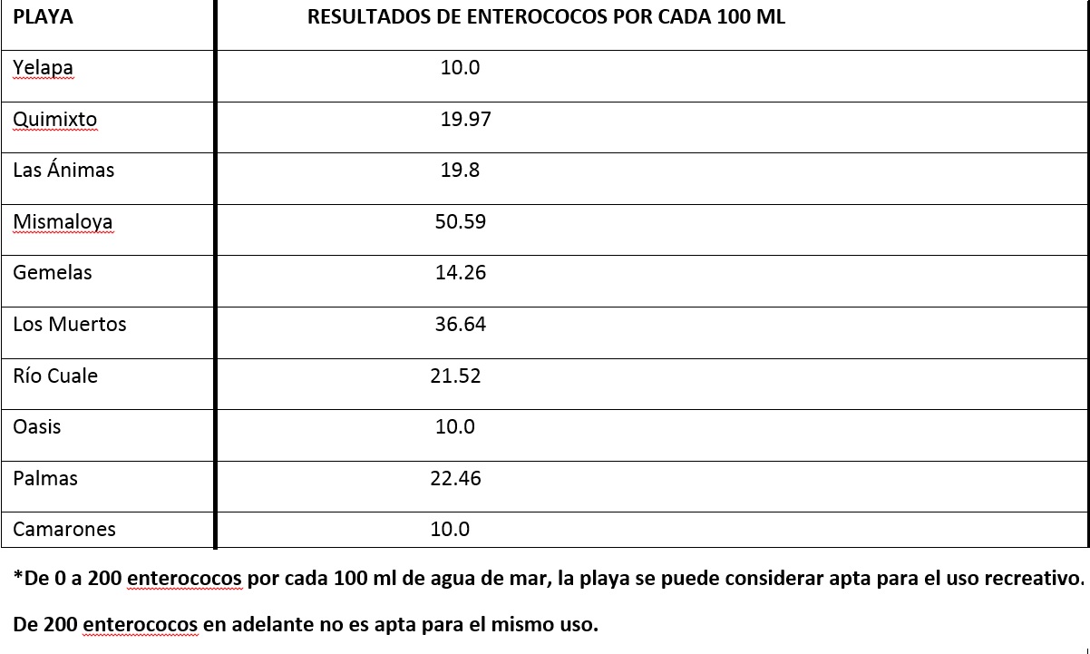 A través del programa de la calidad del agua “Playas Limpias” confirmó que en las diez playas monitoreadas no se supera el índice permitido de enterococos, según criterios de la Cofepris, las cuales son: Yelapa, Qumixco, Las Ánimas, Mismaloya, Gemelas, Los Muertos, Río Cuale, Camarones, Palmas y Oasis.