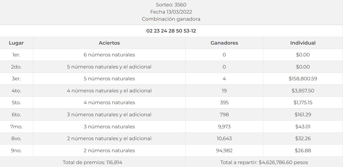 - Melate: 2 24 28 23 50 53 ... y el adicional, 12