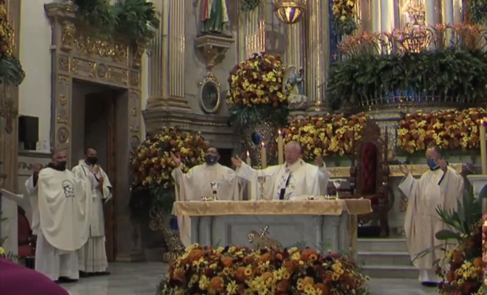 Tras la llegada de la Generala a la Basílica de Zapopan, el Cardenal de Guadalajara Francisco Robles Ortega oficia una misa a la que soló pudieron accesar un grupo reducido de fieles quienes fueron acomodados para mantener su sana distancia.