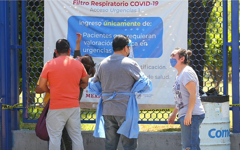 En la puerta se ha instalado un precario campamento de quienes tienen a alguien ahí, entre los pasillos del laberinto hospitalario. Entre hules que sirven de techo, dos pequeños completamente desnudos son bañados por su mamá a jicarazos. Observan, indiferentes, el ir y venir de la gente que detrás de un cubrebocas oculta el rostro de su desesperación.