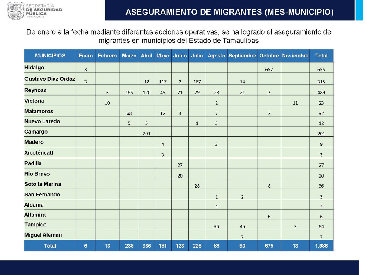 Tan solo la Secretaría de Seguridad Pública reportó que de enero a noviembre lograron el aseguramiento de 1,986 personas extranjeras que eran trasladadas a la frontera norte, de estos 670 eran niños o adolescentes. El municipio que ha tenido el mayor número de aseguramiento es Hidalgo con un total de 655 migrantes, fue aquí donde el pasado 8 de octubre se localizaron tres camiones donde viajaban 652 personas centroamericanas en condiciones infrahumanas.