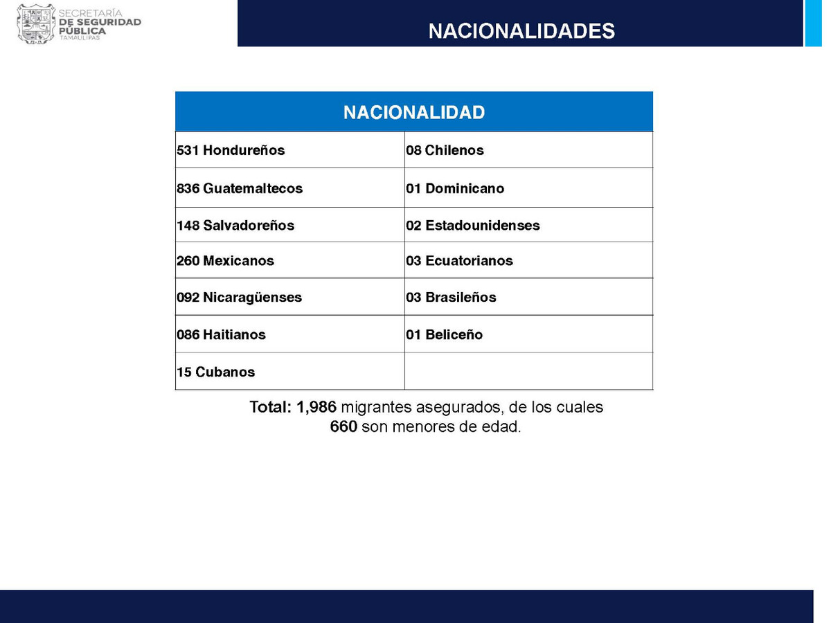 De los 1,986 migrantes que fueron rescatados o liberados por parte de la Secretaría de Seguridad Pública de Tamaulipas, 531 eran hondureños, 836 guatemaltecos, 148 salvadoreños, 260 mexicanos, 92 nicaragüenses, 86 aternos, 15 cubanos, 9 chilenos, un dominicano, dos estadounidenses, tres Ecuatorianos, 3 brasileños y uno era de Belice.
