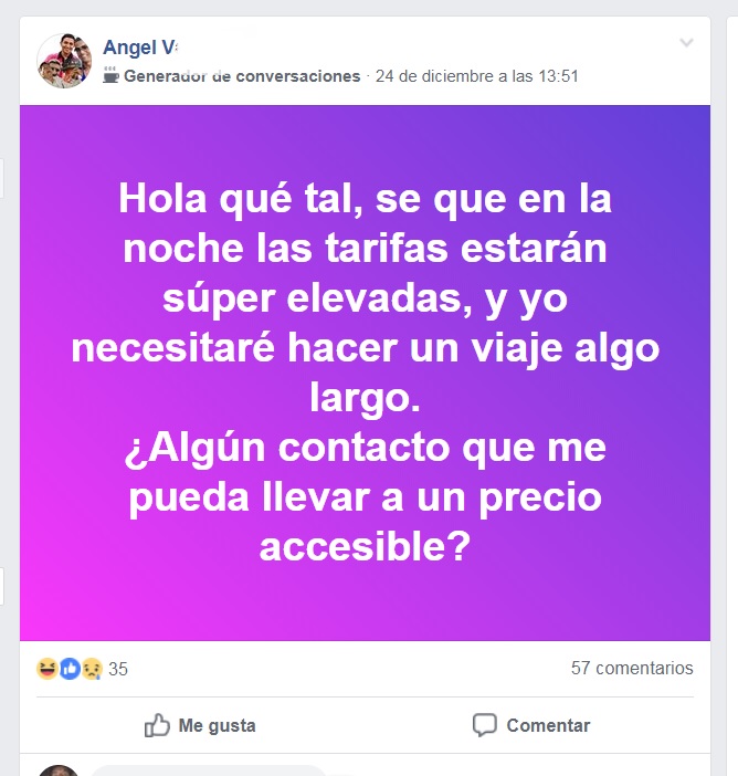 “Hola, qué tal, sé que en la noche las tarifas estarán súper elevadas y yo necesitaré hacer un viaje largo ¿Algún contacto que me pueda llevar a un precio accesible?”.
