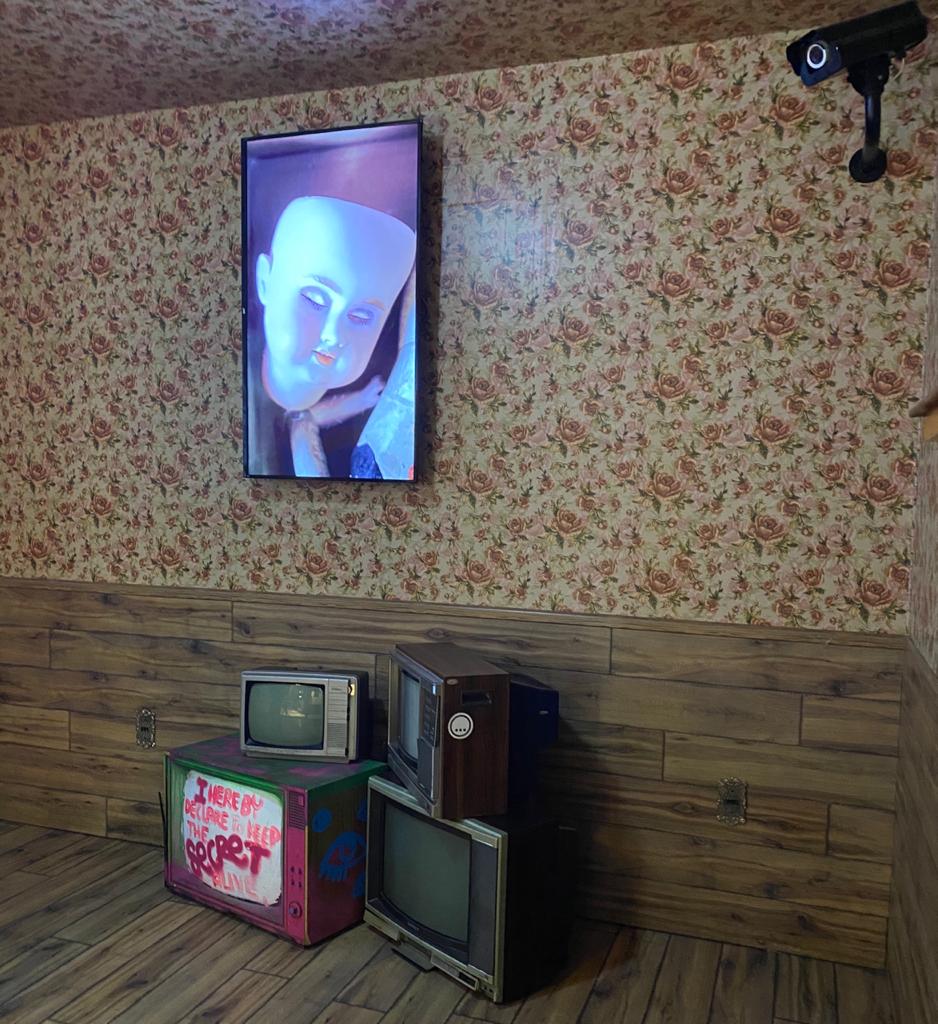 Al lugar se entra por unas cortas escaleras que te llevan a la entrada de un cuarto ambientado con tapiz floreado, piso de aparente madera y cuatro televisores que remiten a tiempos antiguos.