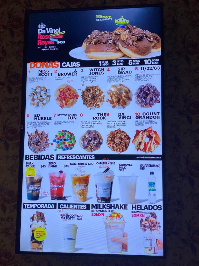 El precio de cada dona es de 50 pesos, pero hay promociones como 3 x $135, 5 x $205 y 10 x $390. Y los precios de las bebidas van desde los 35 hasta los 80 pesos.