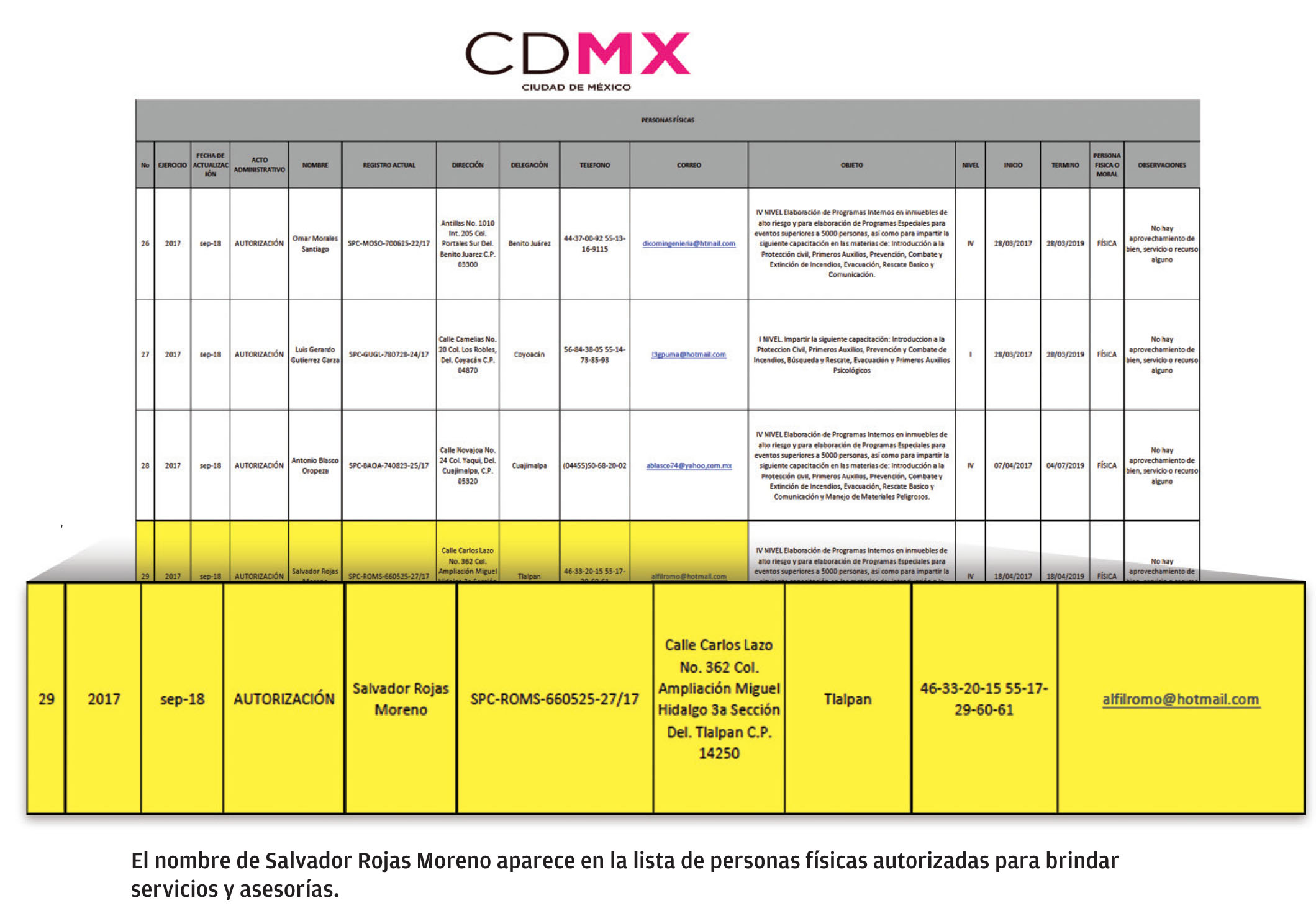 En el listado de terceros acreditados, de personas que pueden dar cursos de protección civil o preparar a las empresas para que se certifiquen, que puede consultarse en la página de internet de la Secretaría de Protección Civil, se encuentra el nombre del ex director Salvador Rojas Moreno como las personas físicas.
