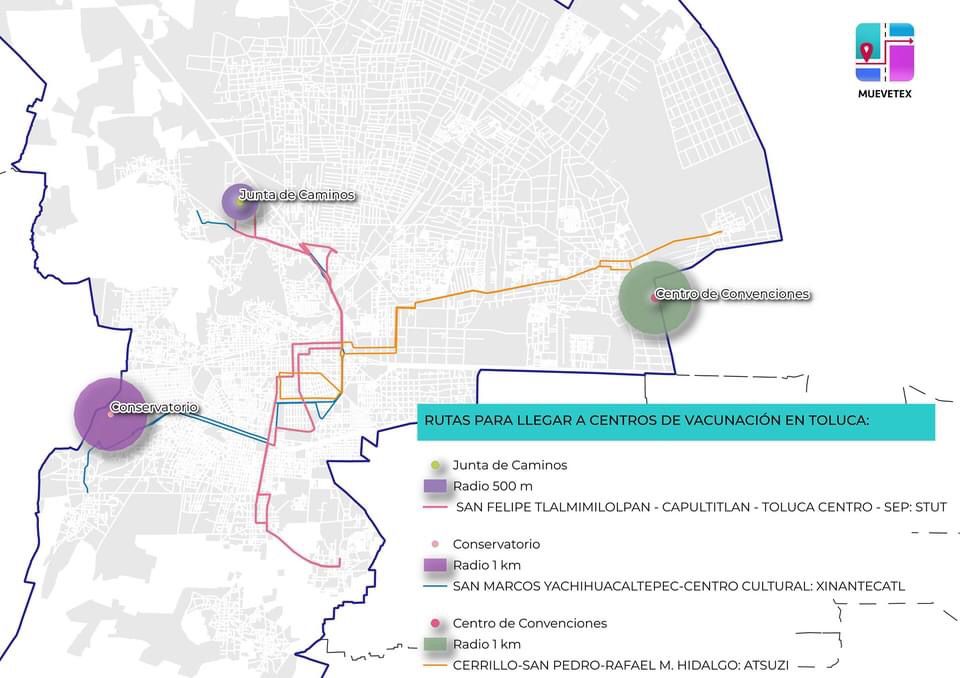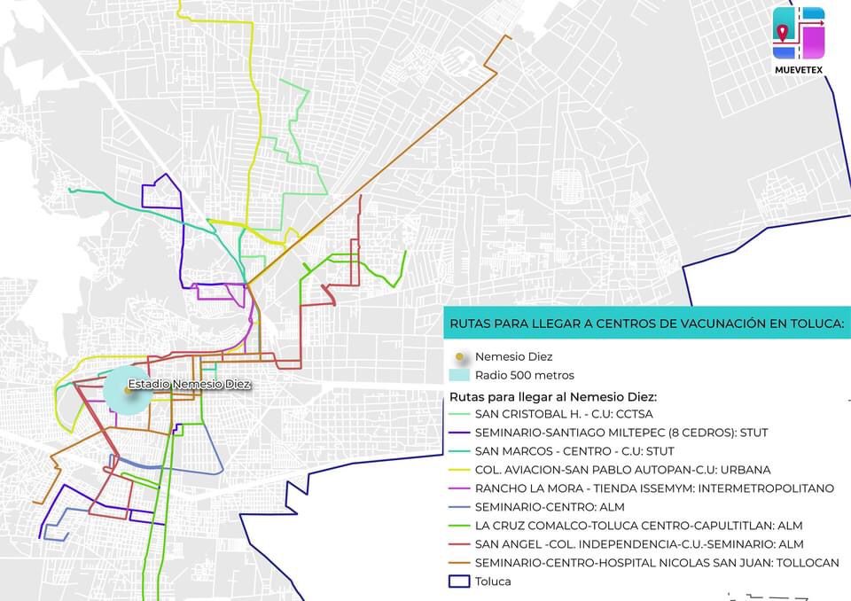 La iniciativa de movilidad urbana “Muevetex” dieron a conocer un mapa con las rutas de transporte para los cuatro puntos de vacunación contra covid-19 en el municipio de Toluca. La propuesta pretende auxiliar a la ciudadanía de entre 50 y 59 años a llegar rápido a los centros, especialmente para aquellos que se trasladan en servicio público.