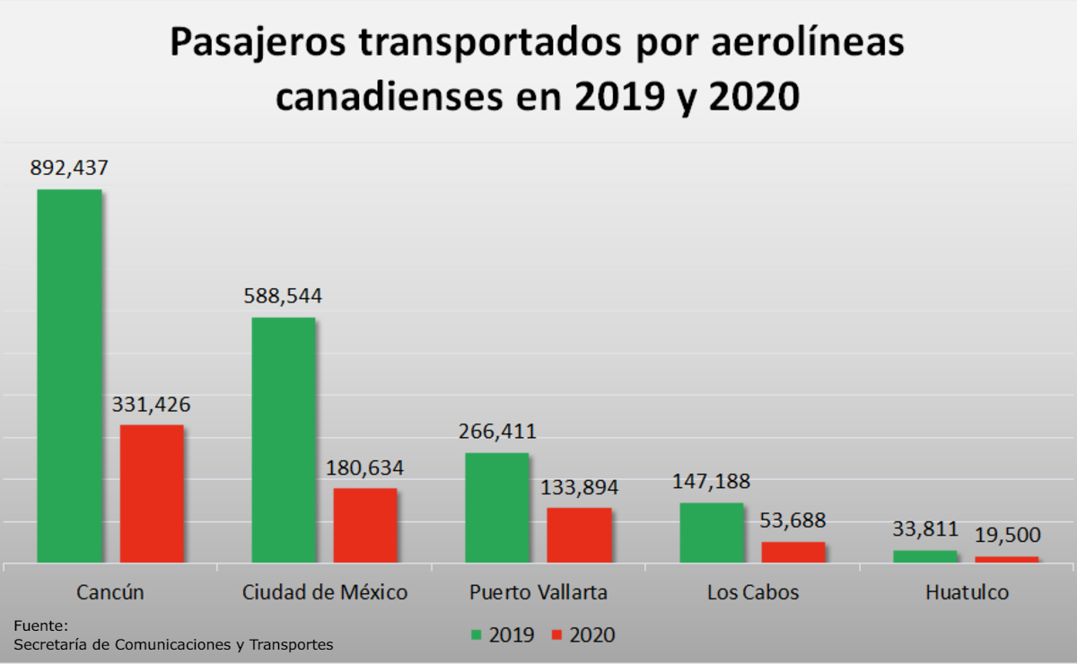 De acuerdo con la Secretaría de Comunicaciones y Transportes (SCT), 3 millones 677 mil 56 pasajeros llegaron a México a través de aerolíneas canadienses en 2019; cifra que se redujo a un millón 815 mil 147 en 2020, debido a la pandemia, lo que representó una caída de 50.64 por ciento.