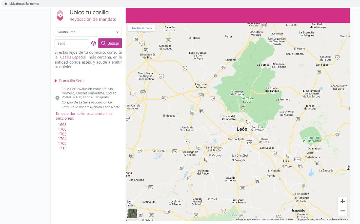 Los habitantes en Guanajuato que deseen participar en la revocación de mandato pueden ubicar su casilla en la página web del INE https://ubicatucasilla.ine.mx/, en esta se debe seleccionar la entidad correspondiente así como ingresar la sección, misma que puedes encontrar en tu credencial para votar del INE.