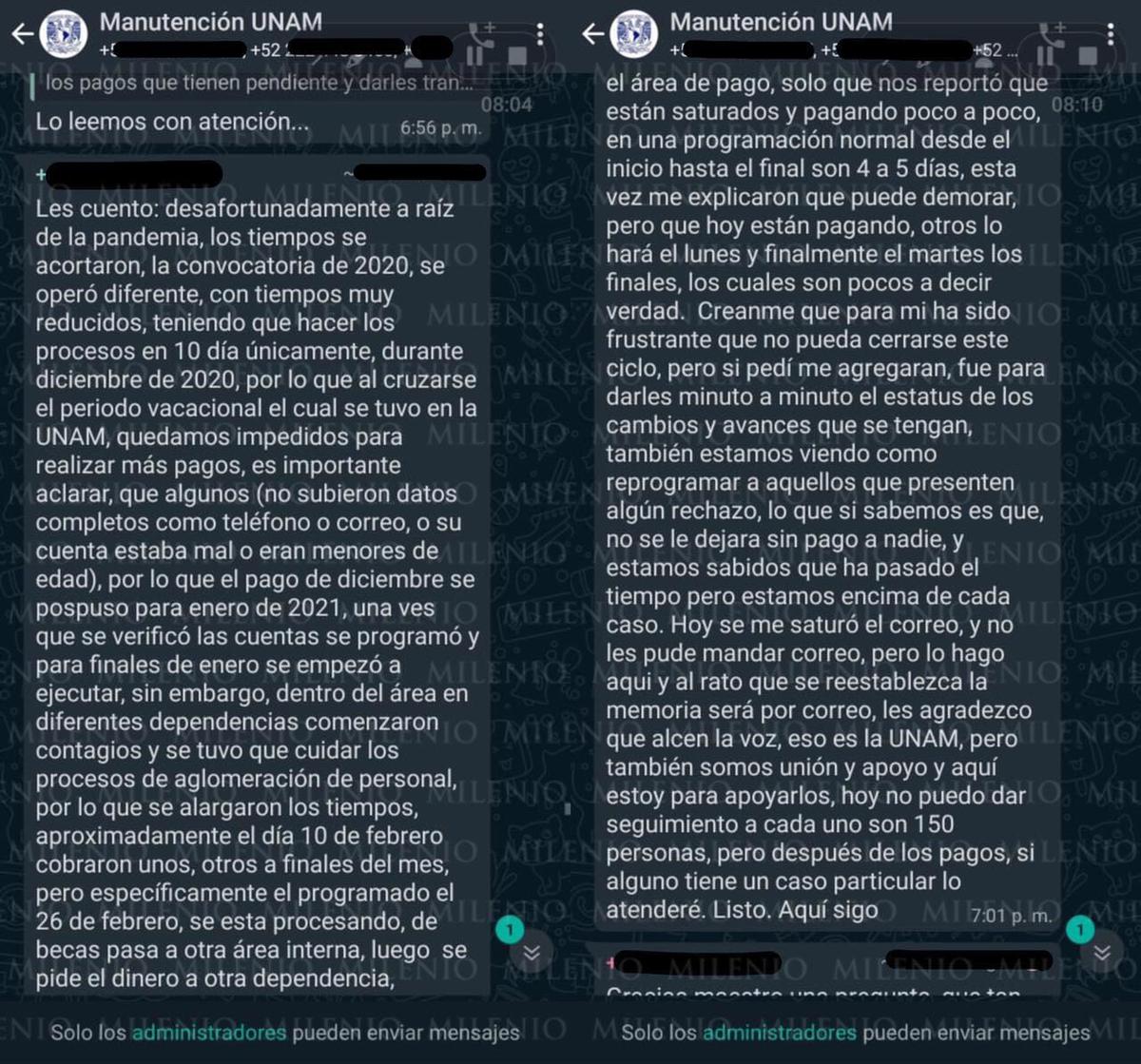 “Después su bandeja de entrada del correo se saturó y pidió que lo agregaran al grupo de WhatsApp para tener una atención más personalizada. Cuando lo agregan todos los chicos comienzan a exponer sus casos, pedir una respuesta, a lo que les dice que 'tengan calma, que la UNAM no iba a parar, que estaban haciendo hasta lo imposible para los pagos' pero esos procesos son desde diciembre-enero y ya es marzo y siguen como si nada”.