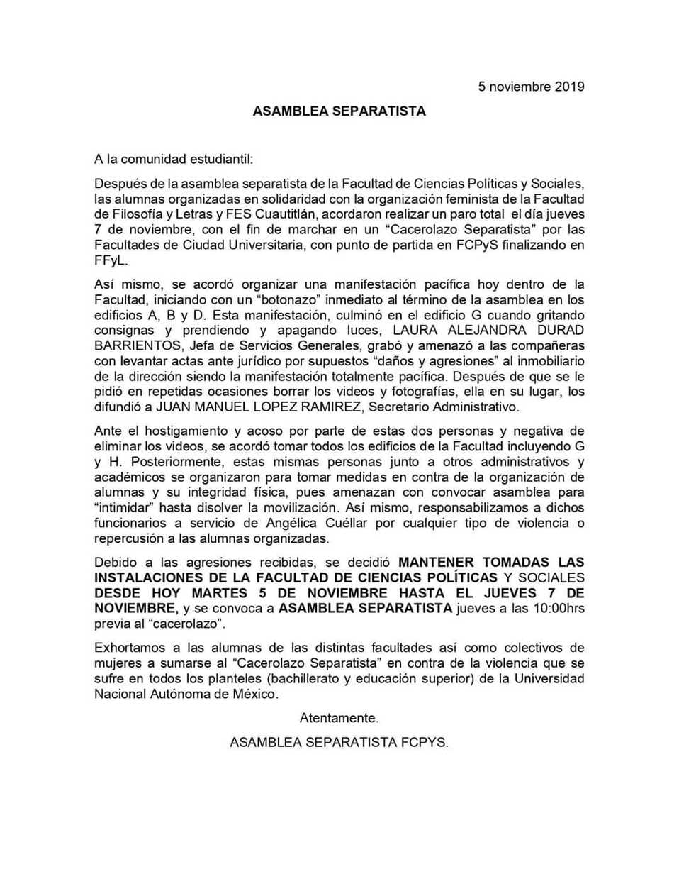 A través de un comunicado, el grupo denominado "Asamblea Separatista" explicó que en una reunión en la facultad se acordó un paro el 7 de noviembre, en solidaridad con la organización feminista de la Facultad de Filosoía y Letras, además de la FES Cuatitlán para posteriormente realiza una marchar y realizar un "cacerolazo".