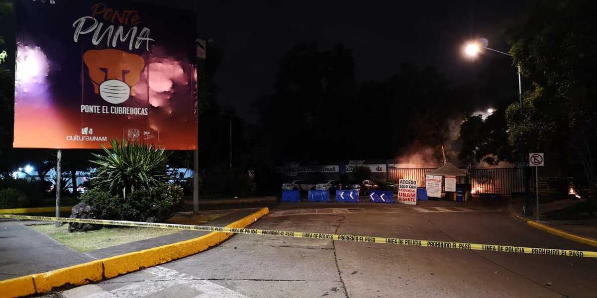 Los manifestantes colocaron pancartas en las rejas de la puerta de acceso y realizaron algunas pintas en las paredes y automóviles de vigilancia de la UNAM, además de que quemaron documentos.