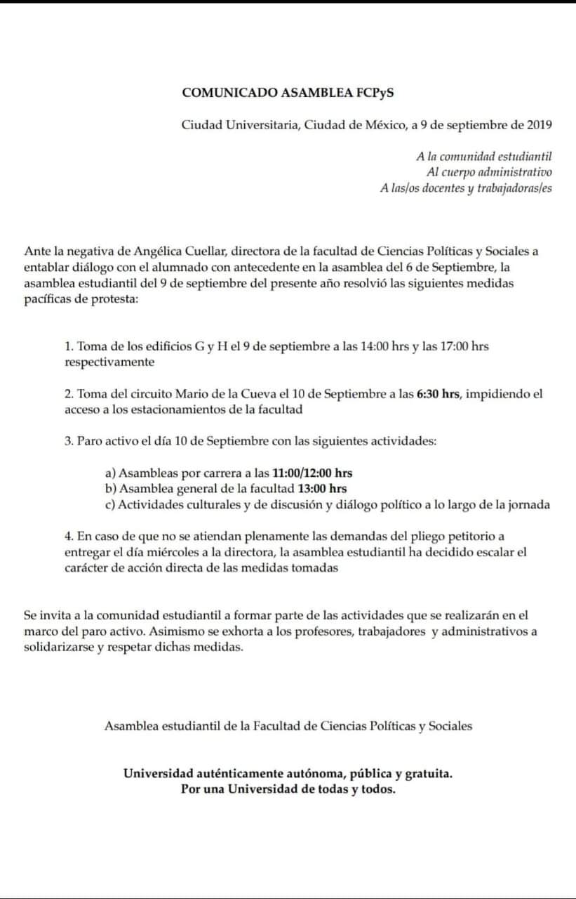 Estudiantes de la Facultad de Ciencias Políticas y Sociales (FCPyS) de la UNAM anunciaron que este martes 10 de septiembre realizarán un paro activo de labores, así como actos de protesta en Ciudad Universitaria, como parte de su inconformidad por la presencia del ex candidato presidencial Ricardo Anaya.