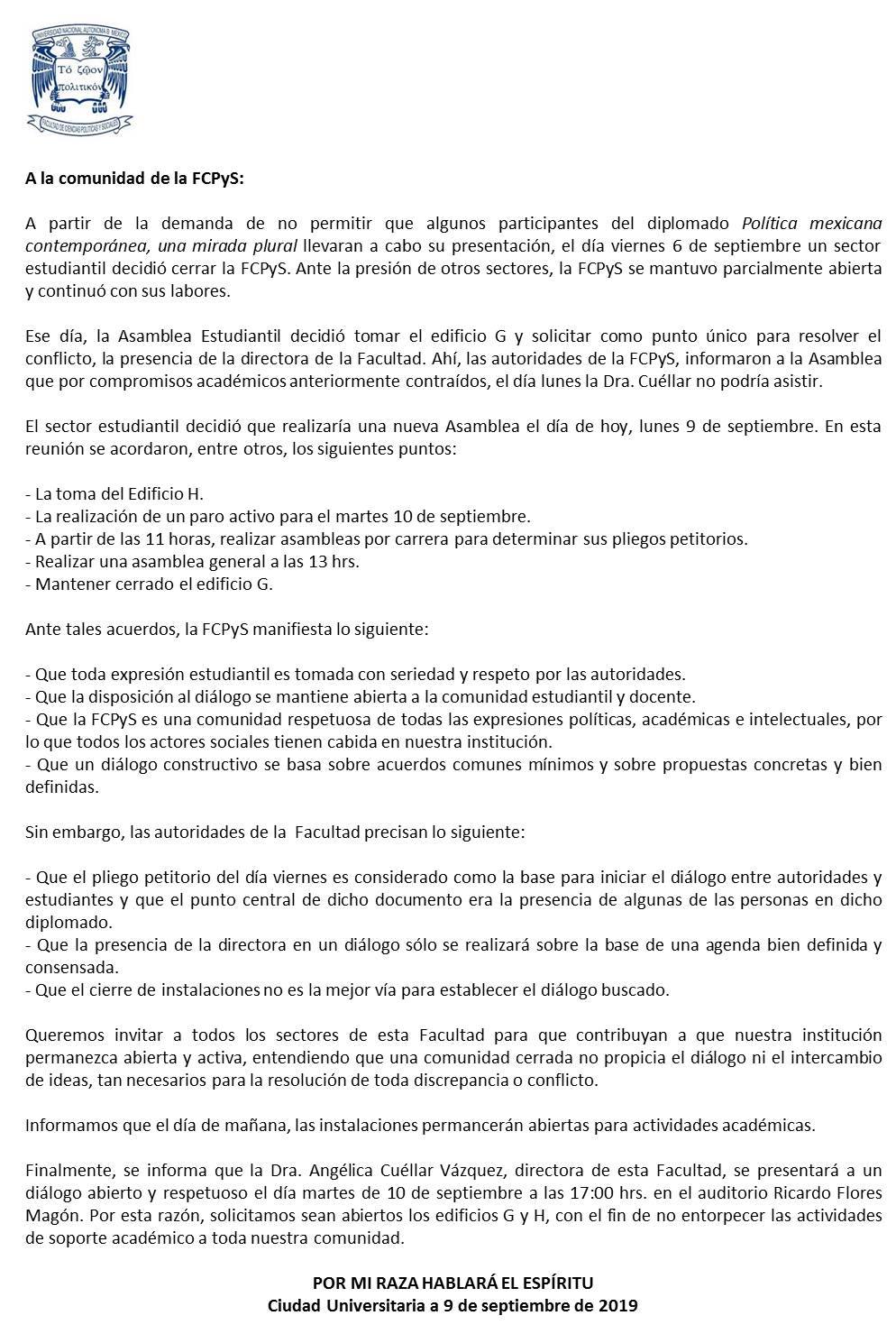 La Facultad de Ciencias Políticas y Sociales informó que la directora del plantel, Angélica Cuéllar, se presentará a diálogo mañana con los estudiantes a las 17: 00 horas.