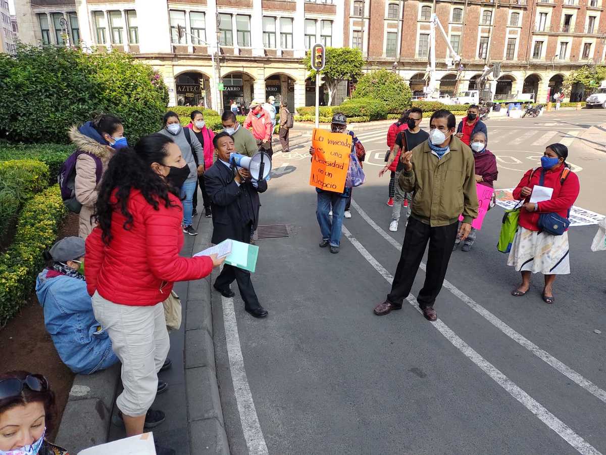 Integrantes de la Unión Ciudadana Democrática (UCD) arriban al Zócalo capitalino en demanda de vivienda, programas y cambio de semáforo epidemiológico de verde a rojo por el incremento de contagios de la variante ómicron de covid-19.