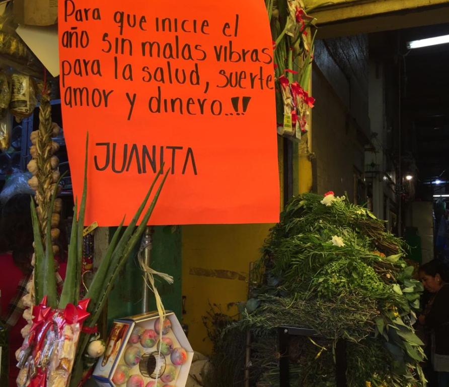En la entrada 9 y pasillo 8 del Mercado de Sonora, Juanita Nieves recomienda una buena limpia y su amuleto, "para que inicien bien el año sin malas energías, sin envidia. Se utiliza para recibir el año bien para que entremos con más ganas de trabajar con más buenas vibras y bien despojados".