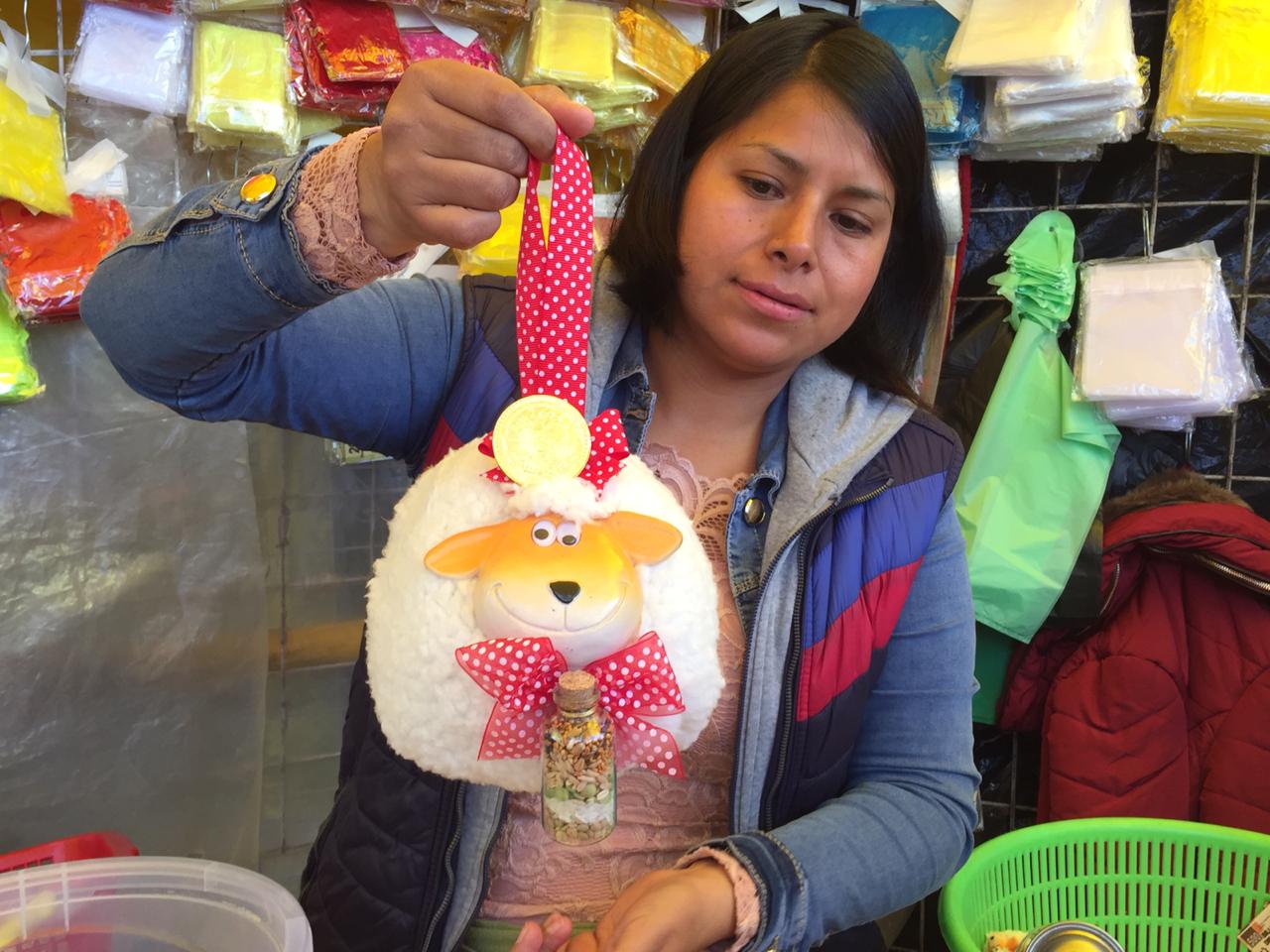 De lo más vendido en el mercado son los borreguitos que, según la creencia, se cuelgan una en la puerta para que no le falte lana durante todo el año.