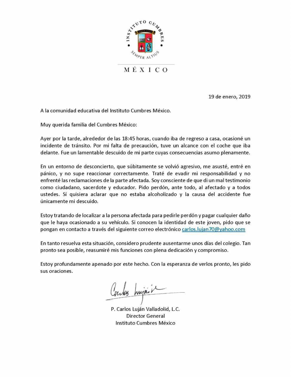 “En un entorno de desconcierto, que súbitamente se volvió agresivo, me asusté, entré en pánico y no supe reaccionar correctamente. Traté de evadir mi responsabilidad y no enfrenté las reclamaciones de la parte afectada. Pido perdón, ante todo, al afectado y a todos ustedes. Sí quisiera aclarar que no estaba alcoholizado y que la causa del accidente fue únicamente mi descuido”.