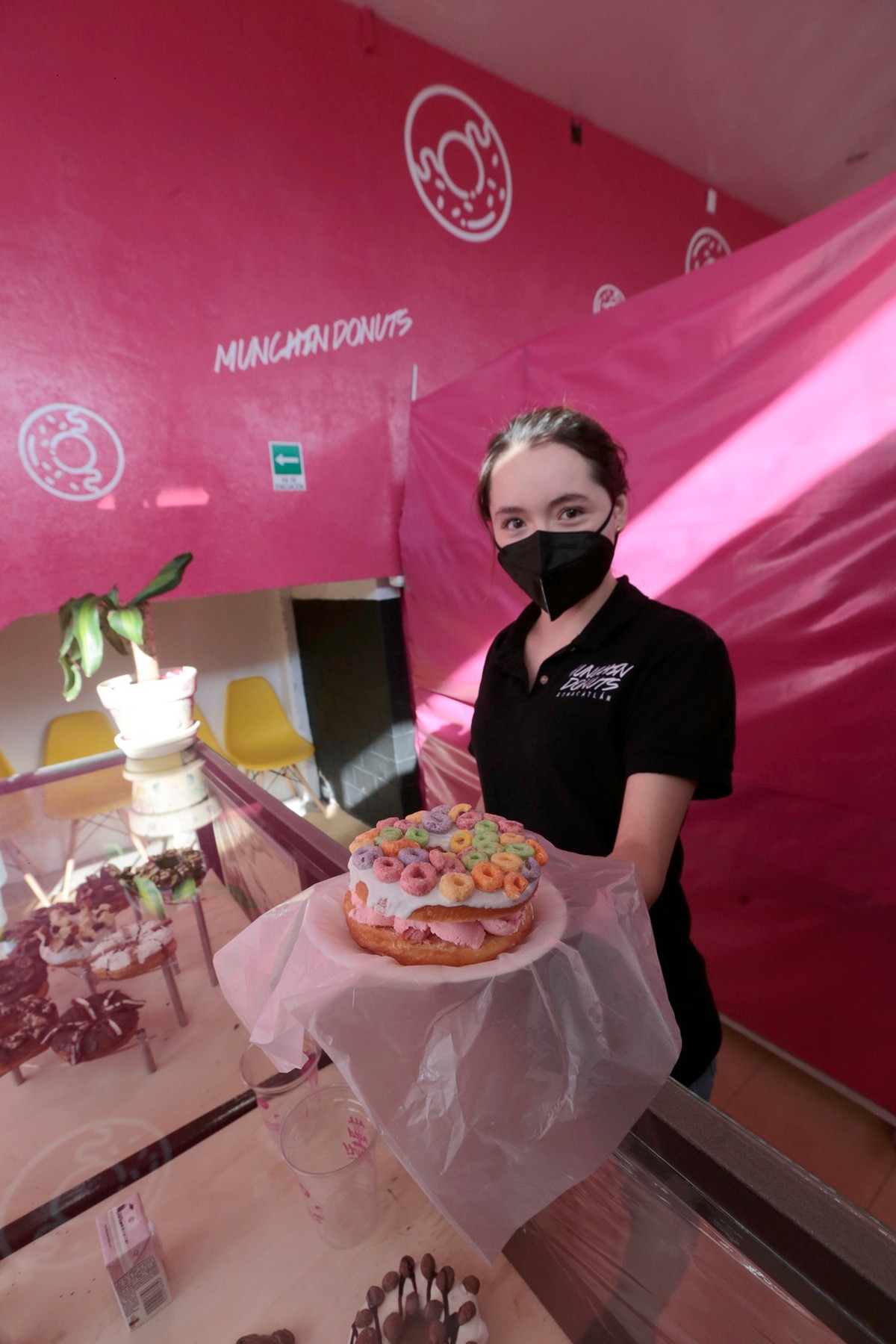 “Vendemos todo tipo de donas con un topping final, chocolate Ferrero, Kit Kat, galleta, cereales, panditas, donas saladas con fruta natural –durazno, fresa o plátano- incluso pizza o tocino, todo depende del gusto. Le damos variedad a los clientes, muchos buscan la de chocolate, pero cuando prueban alguna de nuestras especialidades se enamoran”, refiere el propietario de este concepto, Joel Lechuga García.