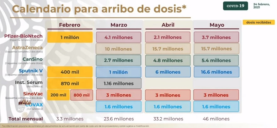 El director de Promoción de la Salud informó que se esperan alrededor de 102.8 millones de vacunas contra coronavirus de las farmacéuticas Pfizer, AstraZeneca, CanSino, Sputnik V, AstraZeneca por el Instituto de la India, SinoVac y Covax, durante los meses de marzo, abril y mayo. Asimismo, puntualizó que durante febrero se han recibido 3.3 millones de dosis.