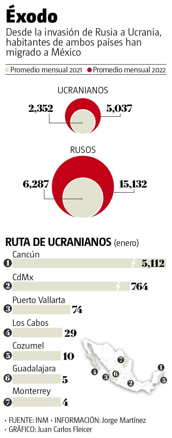 Los tambores de guerra en Europa oriental provocaron que se duplicara la cantidad de ucranianos y rusos que ingresan a México. Mientras que el promedio mensual de ucranianos que llegaron en 2021 fue de 2 mil 352, durante 2022 esta cifra se incrementó a 5 mil 37.