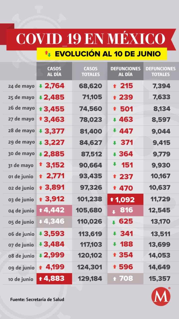 En México, al corte del jueves 10 de junio, se reportaron 15 mil 357 muertes y 129 mil 184 casos acumulados, de los cuales, 19 mil 897 están activos y además se reportaron 53 mil 608 casos sospechosos, informó la Secretaría de Salud en conferencia de prensa sobre el avance de la pandemia en el país.