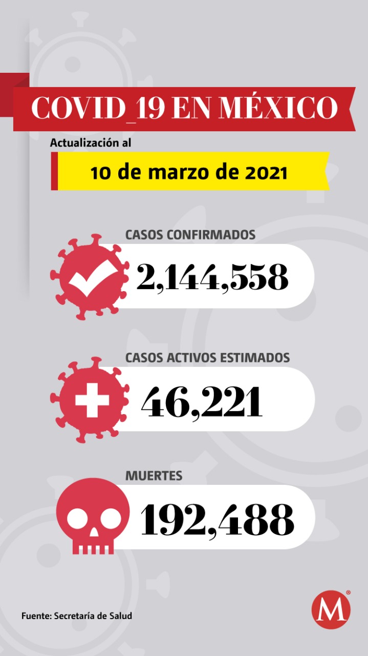 México acumula 192 mil 488 muertes por coronavirus SARS-CoV-2 y 2 millones 339 mil 561 casos estimados, de acuerdo con el reporte de la Secretaría de Salud dado a conocer por José Luis Alomía, director general de Epidemiología.
