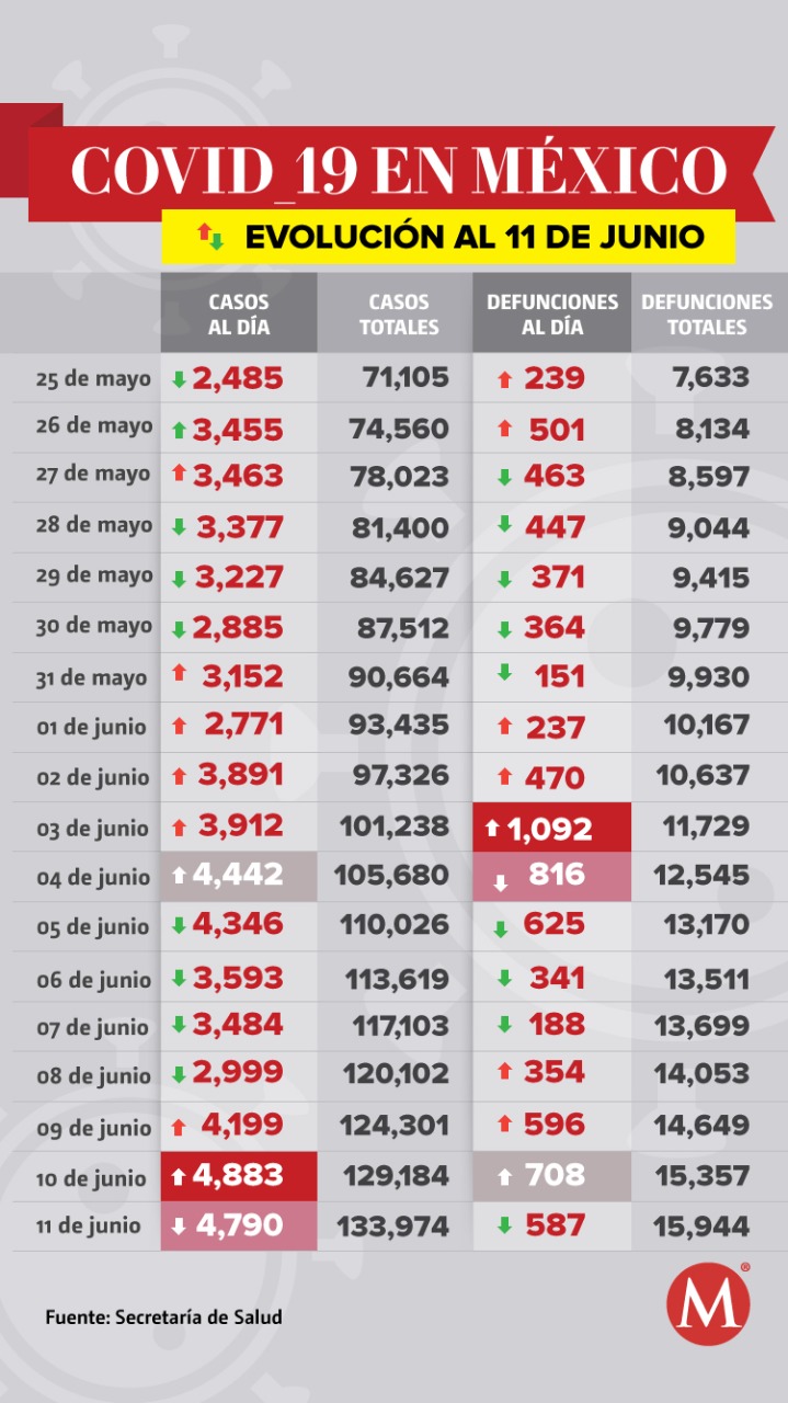 Al corte del 11 de junio, se reportan 15 mil 944 muertes y 133 mil 974