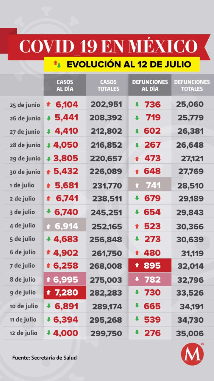 La Secretaría de Salud reportó las cifras del avance de la pandemia del nuevo coronavirus en México, al corte del 12 de julio: