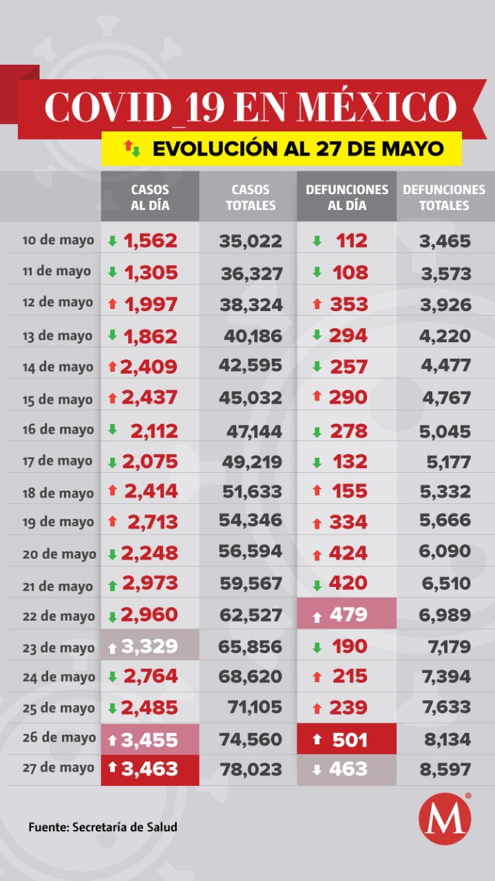 En México, en las últimas 24 horas se reportaron 463 nuevas defunciones, que da una suma de 8 mil 597 muertes; 3 mil 463 nuevos casos de coronavirus, que da un acumulado de 78 mil 23, de los cuales 15 mil 592 están activos; además hay 33 mil 566 casos sospechosos, informó la Secretaría de Salud federal.