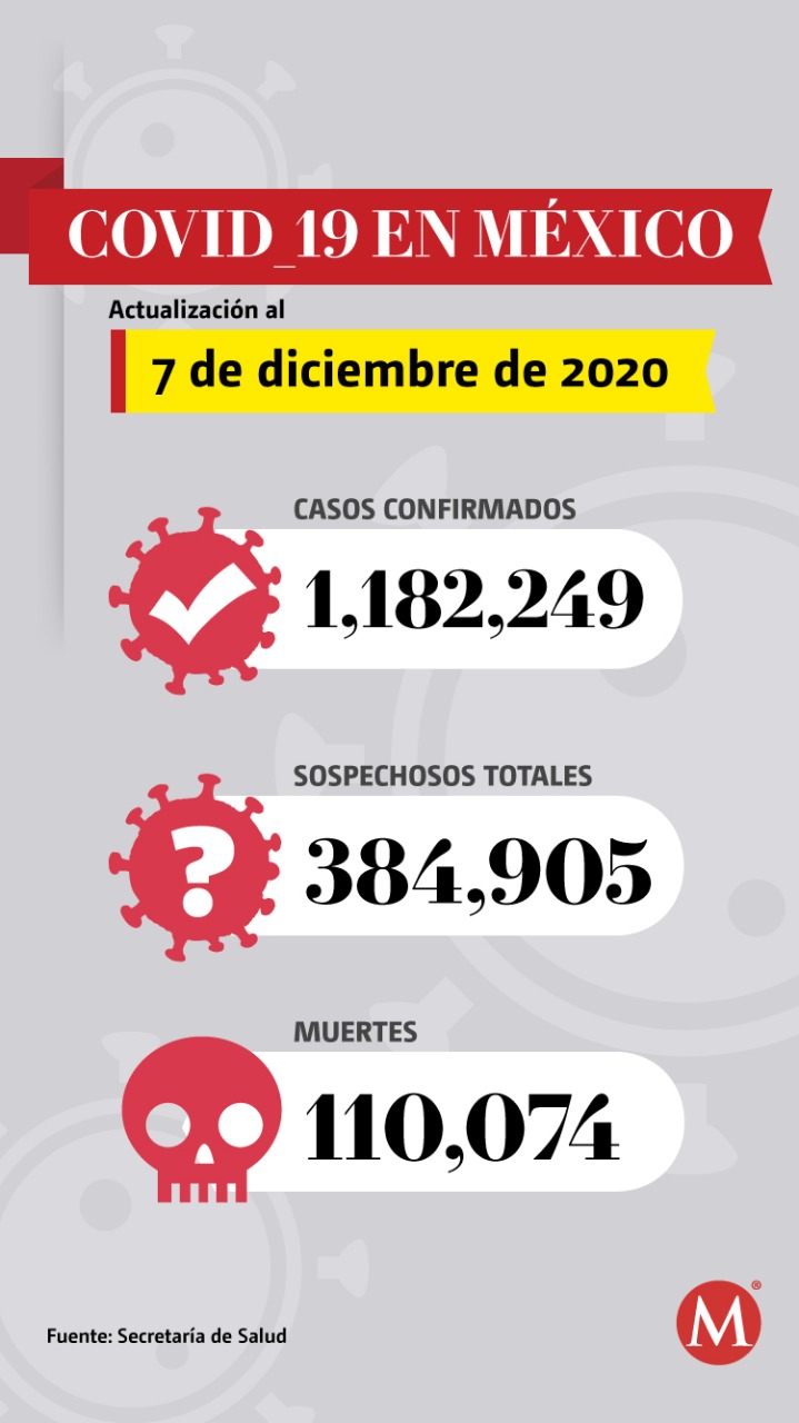 Este lunes 7 de diciembre, México llegó a las 110 mil 74 muertes a causa del SARS-CoV 2, que provoca la enfermedad covid-19, y acumula un millón 182 mil 249 de casos confirmados, de acuerdo con la Secretaría de Salud federal.