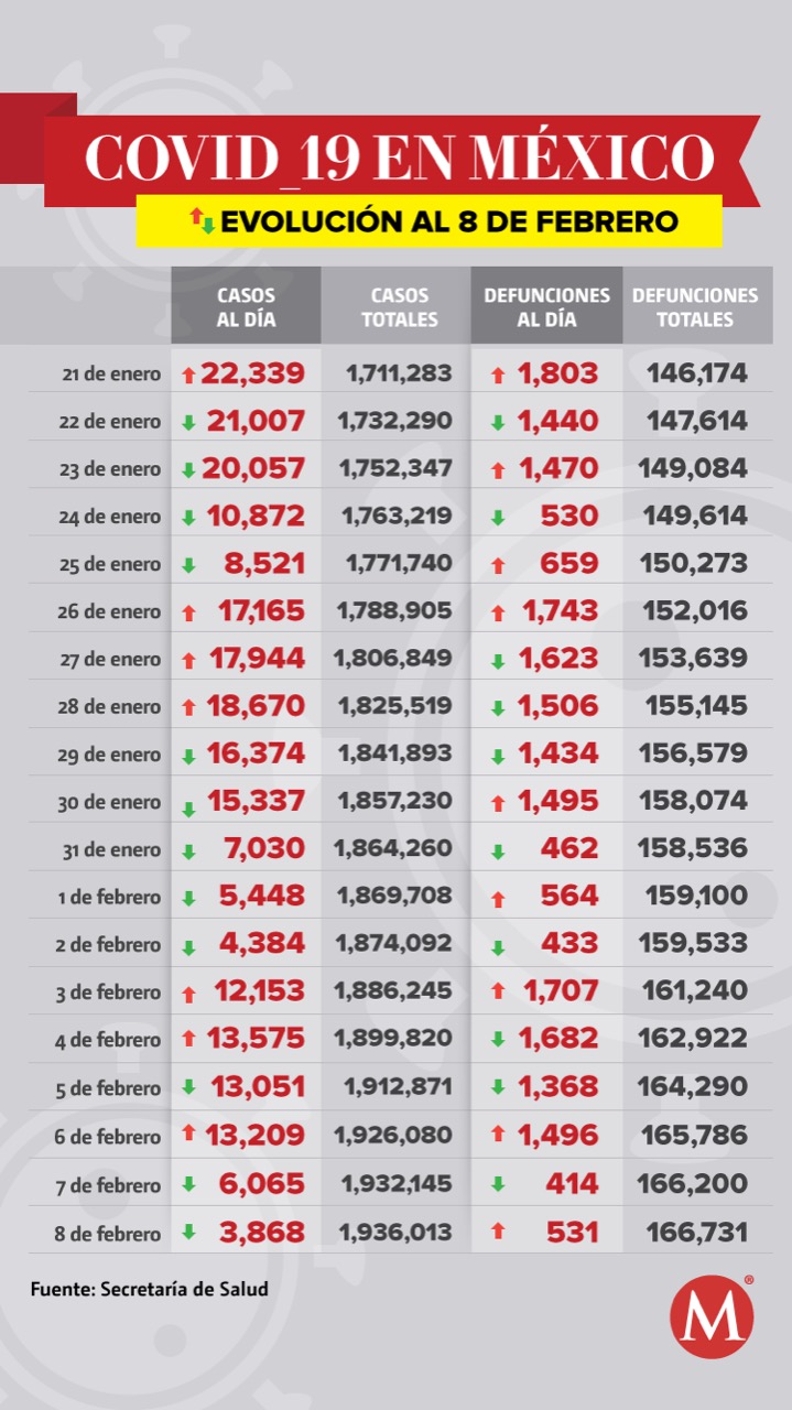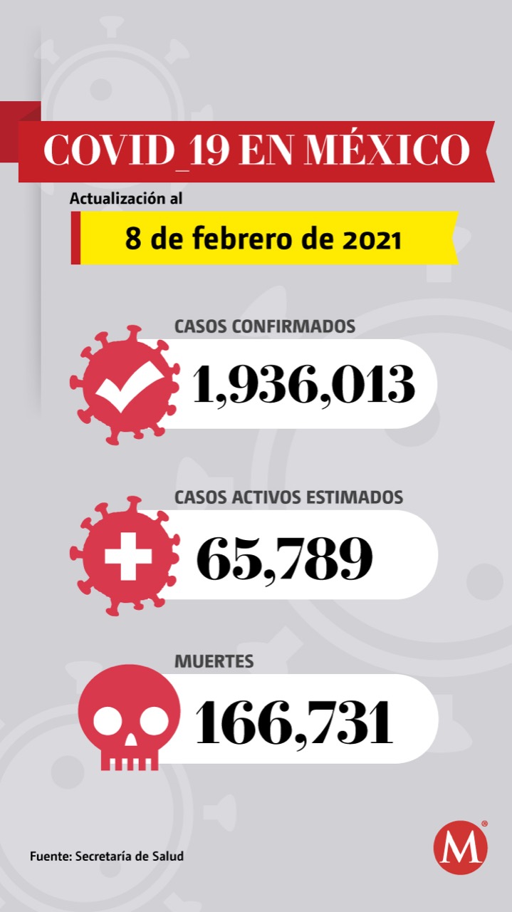 México suma 166 mil 731 muertes por covid-19 hasta este lunes 8 de febrero y 65 mil 789 casos activos estimados, de acuerdo con la información proporcionada por la Secretaría de Salud.
