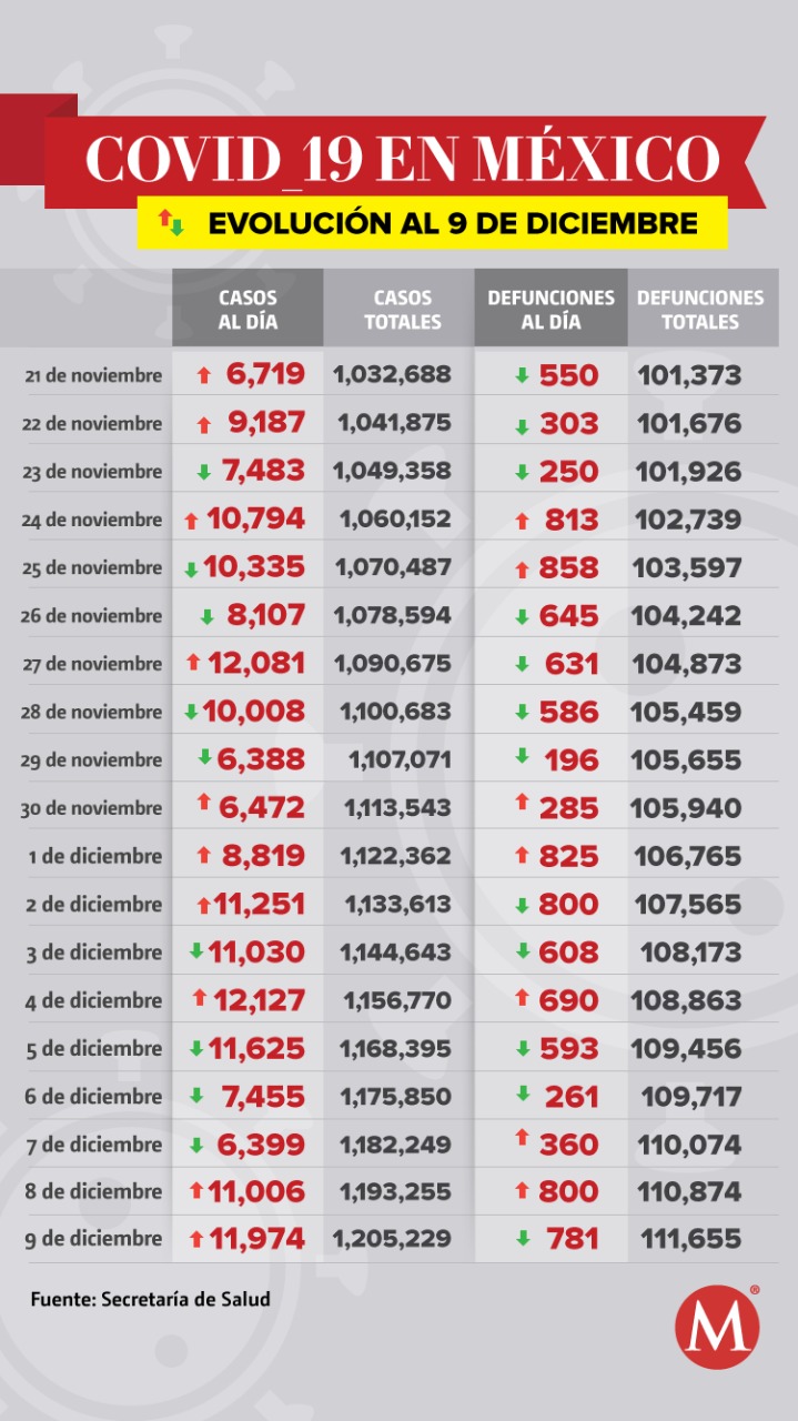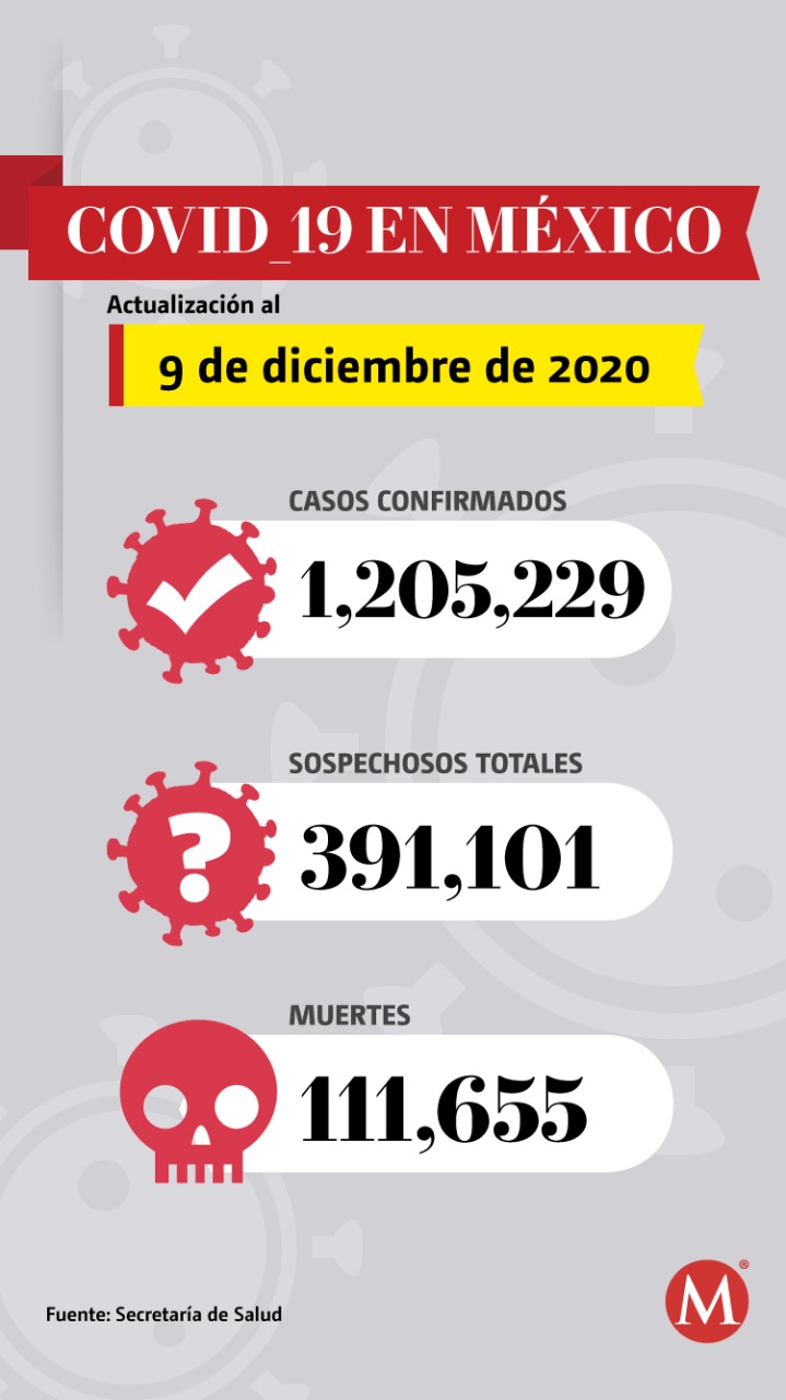 México alcanzó 111 mil 655 muertes por covid-19 y un millón 205 mil 229 casos acumulados de coronavirus SARS-CoV-2, informó la Secretaría de Salud en el reporte dado a conocer este 9 de diciembre.