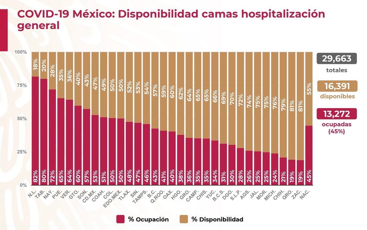 De 29 mil 663 camas de hospital, hay 16 mil 391 disponibles y 13 mil 272 están ocupadas. Los estados con mayor ocupación hospitalaria para camas de atención general son: Nuevo León, Tabasco y Nayarit.