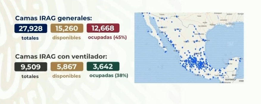 De 27 mil 928 camas, hay 15 mil 260 disponibles y 12 mil 668 están ocupadas. Los estados con mayor ocupación hospitalaria para camas de atención general son: Tabasco, Puebla y Sonora.