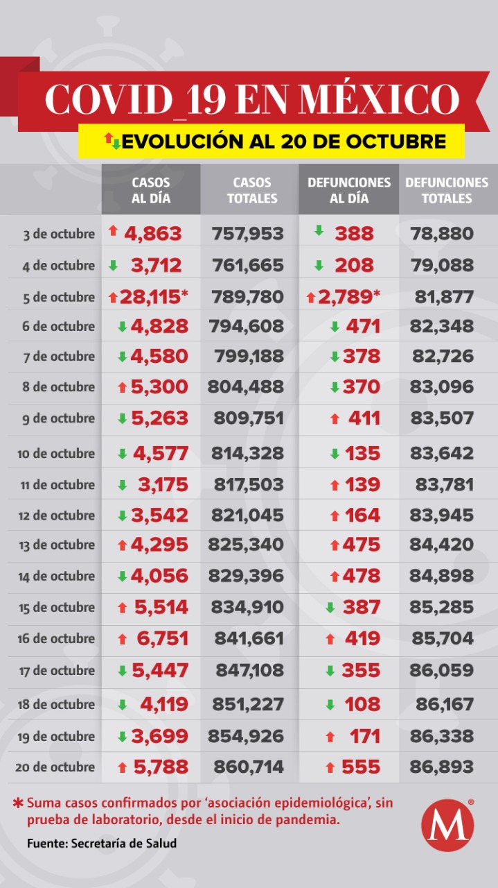 México suma 86 mil 893 muertes por coronavirus SARS-CoV-2 y registra 860 mil 714 casos confirmados acumulados, de acuerdo con el último reporte de la Secretaría de Salud dado a conocer por Hugo López-Gatell, subsecretario de Prevención y Promoción de la Salud.